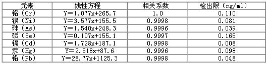 Hg±êÒºµ¥¶ÀΪһ×é¡£¡£¡£¡£¡£Cr ¡¢Ni ¡¢As ¡¢Se ¡¢Cd ºÍPb ±êÒºÓø÷ÔªËØ10¦Ìg/mLµÄ±êҺϡÊÍÖÁËùÐèŨ¶È¡£¡£¡£¡£¡£ÅäÖÆHg±êҺʱ¼ÓÈë0.1mL 20 ¦Ìg/mL½ð±ê×¼ÈÜÒº¡£¡£¡£¡£¡£ÆÊÎöЧ¹û(±í2)ÏÔʾ£¬£¬£¬ £¬ £¬ £¬Õâ7ÖÖÔªËØµÄÏßÐÔ·½³ÌµÄÏà¹ØÏµÊýΪ0.9996¡«1.000 £¬£¬£¬ £¬ £¬ £¬¼ì³öÏÞΪ0.008¡«0.165ng/mL¡£¡£¡£¡£¡£