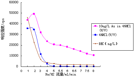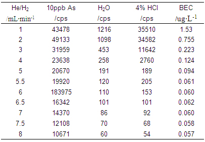 ÒÇÆ÷Ê×ÏÈÔÚ±ê׼ģʽϾÙÐвÎÊýÓÅ»¯£¨Ê¹ÓÃ10¦Ìg¡¤L-1µÄLi¡¢Co¡¢In¡¢U¡¢Ceµ÷гҺ¶ÔÒÇÆ÷ÊÂÇé²ÎÊý¾ÙÐе÷Àí£¬£¬£¬£¬£¬£¬£¬Ê¹ÒÇÆ÷ѸËٶȸߣ¬£¬£¬£¬£¬£¬£¬Í¬Ê±Ñõ»¯Îï¼°Ë«µçºÉ²úÂÊСÓÚ3%£©£»£»£»£»£»£»ÔÙ¿ªÆôHe/H2Åöײ·´Ó¦Æø£¬£¬£¬£¬£¬£¬£¬Öð²½Ôö´óHe/H2Á÷Á¿£¬£¬£¬£¬£¬£¬£¬²âÊÔ³¬´¿Ë®¡¢4%HCl¼°10¦Ìg¡¤L-1 As£¨4%HCl½éÖÊ£©ÔÚ75amu´¦µÄÏìÓ¦Ðźţ¬£¬£¬£¬£¬£¬£¬ÅÌËãÆäÅä¾°µÈЧŨ¶È£¨ÏêϸÊý¾Ý¼û±í1¼°Í¼1£©£»£»£»£»£»£»²¢Ê¹ÓÃAs±êÒº½øÒ»²½ÓÅ»¯He/H2Á÷Á¿£¬£¬£¬£¬£¬£¬£¬»ñµÃÒÇÆ÷ÊÂÇé²ÎÊýÈç±í2Ëùʾ¡£¡£¡£¡£¡£¡£¡£¡£