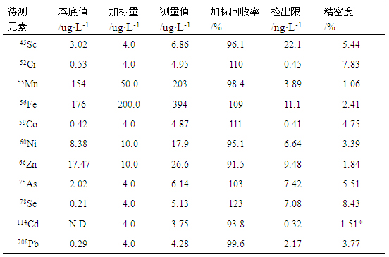 ÔÚÒÇÆ÷ÓÅ»¯ÊÂÇé²ÎÊýÌõ¼þÏ£¬£¬£¬£¬£¬£¬£¬¶ÔÑùÆ·ÈÜÒº¼°¼Ó±êÑùÒº¾ÙÐвâÊÔ£¬£¬£¬£¬£¬£¬£¬ÅÌËãÆä¼Ó±ê½ÓÄÉÂÊ£»£»£»£»£»£»¶ÔÑùÆ·¿ÕȱÈÜҺƽÐвⶨ7´Î£¬£¬£¬£¬£¬£¬£¬ÒÔÈý±¶¿ÕȱÐźűê×¼Îó²î/ѸËٶȶÔÓ¦µÄŨ¶ÈΪ¼ì³öÏÞ£»£»£»£»£»£»Í¬Ê±¶ÔÑùÆ·ÈÜҺƽÐвⶨ11´Î£¨¾àÀë2min£©£¬£¬£¬£¬£¬£¬£¬ÅÌËãÆäÏà¶Ô±ê×¼Îó²î£¬£¬£¬£¬£¬£¬£¬¿¼²ìϸÃܶȣ¬£¬£¬£¬£¬£¬£¬Êý¾Ý¼û±í4¡£¡£¡£¡£¡£¡£¡£¡£¸÷ÔªËØ¼ì³öÏÞÔÚ0.41-22.07ng/LÖ®¼ä£¬£¬£¬£¬£¬£¬£¬¼Ó±ê½ÓÄÉÂÊÔÚ93.82%-123.10%Ö®¼ä£¬£¬£¬£¬£¬£¬£¬Ï¸ÃܶÈÔÚ1.06%-8.43%Ö®¼ä¡£¡£¡£¡£¡£¡£¡£¡£